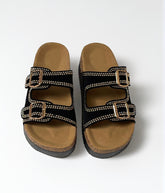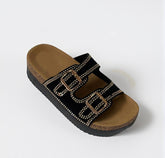 Sandalia de doble hebilla con detalle de aplicaciones metálicas que elevan el diseño clásico.