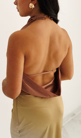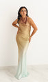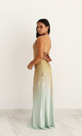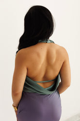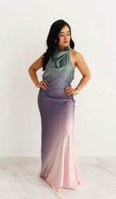 Vestido de fiesta largo , escote frontal tipo halter y escote en la espalda .