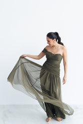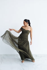 VESTIDO DE FIESTA VERDE OLIVO, STRAPLESS.
