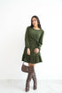 Vestido verde oliva con nudo en cintura y vuelo en la parte inferior.